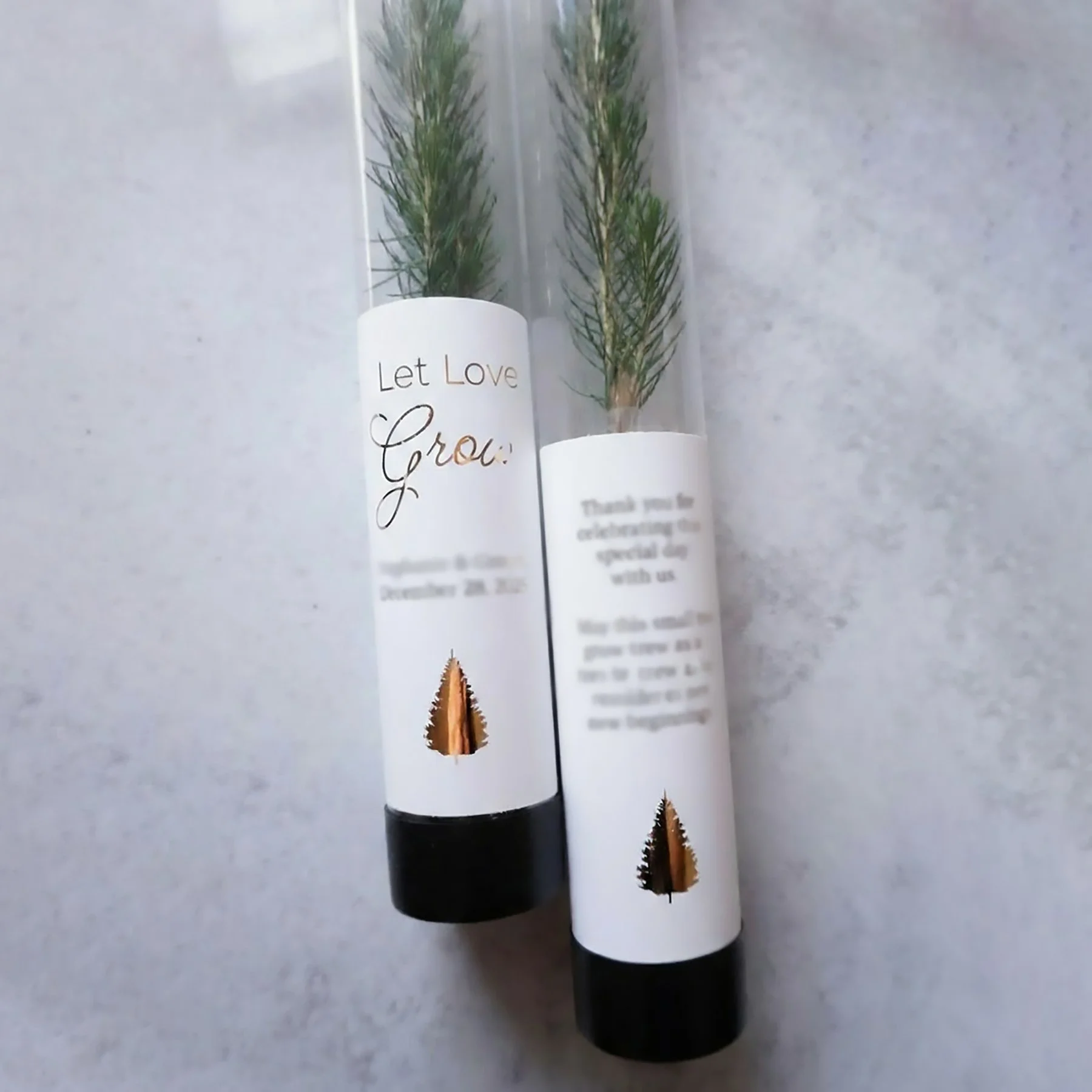 A symbolic gift of growth and new beginnings, elegantly packaged for weddings, baptisms, or first communions. Each favor includes a live pine sapling in a sleek cylinder with gold foil details.