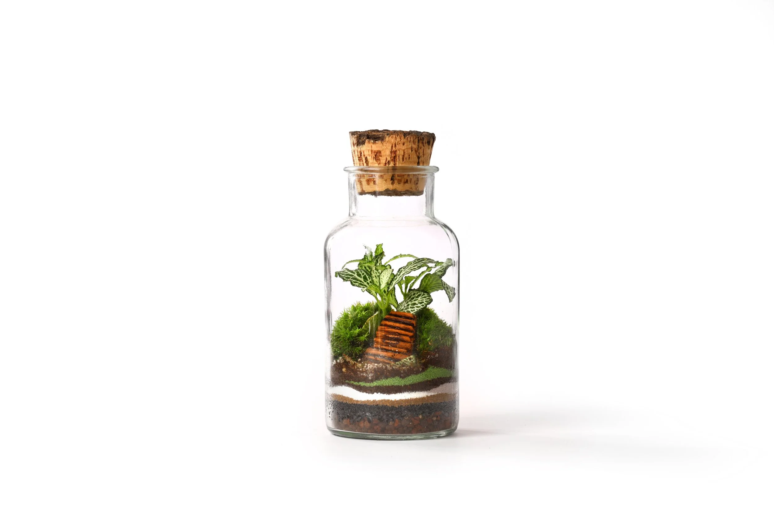 Refined miniature terrarium, ideal as an elegant decorative accent or sophisticated event favor, showcasing delicate plant life.